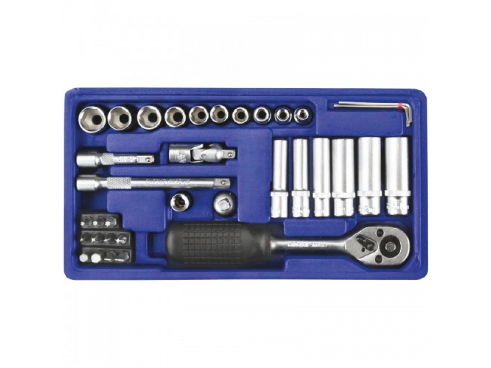 Набор головок, 37 предметов. 10 - шестигранных головок 4-13 мм. 6 - шестигранных длинных головок 6-13 мм. 1 - трещётка. 1- карданный шарнир. 2 — удлинителя 5 см. и 10 см. 3 — шестигранных ключа 1.5; 2;2.5. 1- держатель бит. 1- адаптер 1/4(М)*3/4(F). 11 — битТ10-Т30(+) 1,2 (+) 1,2(-)3,4,5. Качественная ванадиевая сталь. Крутящий момент +15%. Крепкий инструментальный ящик.