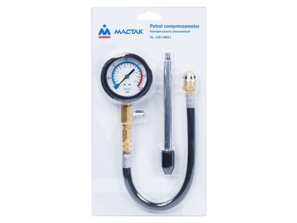 Компрессометр бензиновый, 0-21 атм МАСТАК 120-10021 предназначен для проверки компрессии в цилиндрах бензиновых двигателей. Описание - Диапазон измеряемой компрессии: 0-21 бар (300 psi) - Резьбовые адаптеры для свечей 14 и 18 мм - Устройство с клапаном фиксации измеряемой компрессии и кнопкой сброса - Гибкий резиновый шланг 325 мм - Жесткая насадка 150 мм с резиновым коническим наконечником - Адаптер для быстрой смены насадок