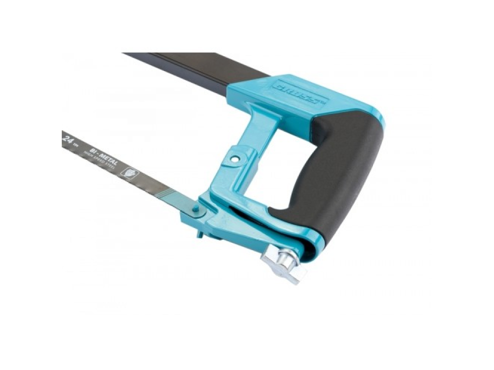Ножовка по металлу "PIRANHA" торговой марки GROSS изготовлена из прочного алюминиевого сплава. Поверхность ножовки покрыта дополнительным слоем эмали, который защищает металл от воздействия окружающей среды. Обрезиненная рукоятка удобно и надежно фиксируется в руке, тем самым повышая эффективность инструмента в работе. Рычажно-винтовой механизм натяжения полотна расположен непосредственно под рукояткой. Усилие, с которым можно зафиксировать полотно, составляет 170 KGF, что позволяет эффективно контролировать давление полотна на заготовку и обеспечивает прямой, точный и ровный пропил. Ножовка комплектуется биметаллическим полотном. Длина полотна 300 мм, шаг зуба 24 TPI (24 зуба на дюйм, 1 дюйм = 2,54 см). Конструкция ножовочной рамки позволяет устанавливать полотно под углом 45° и 90°.