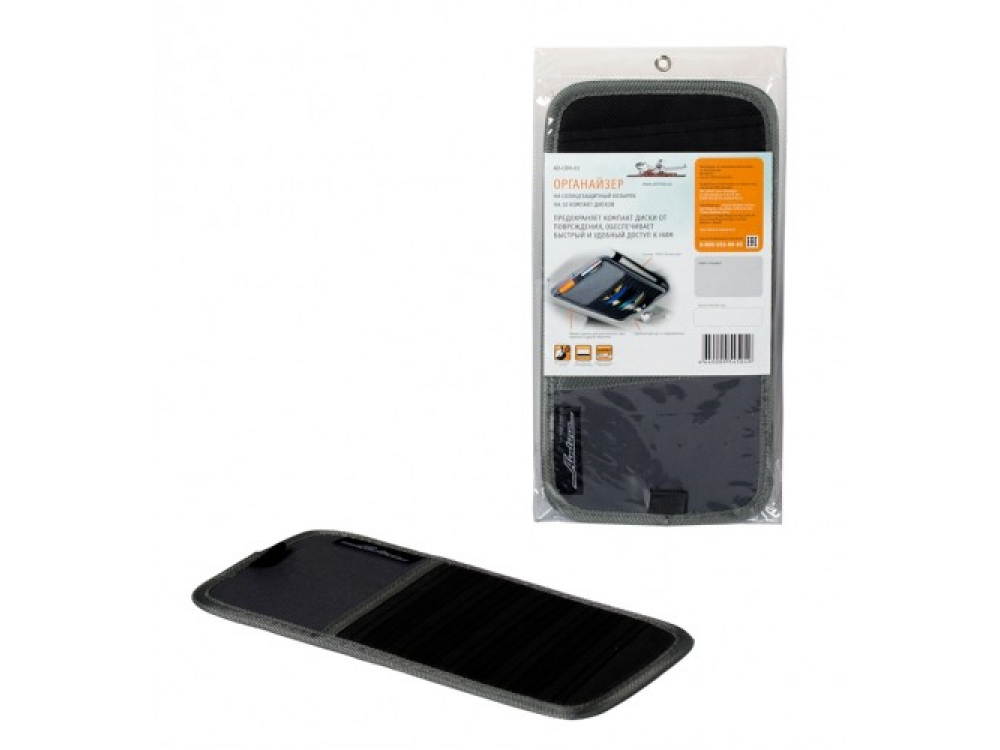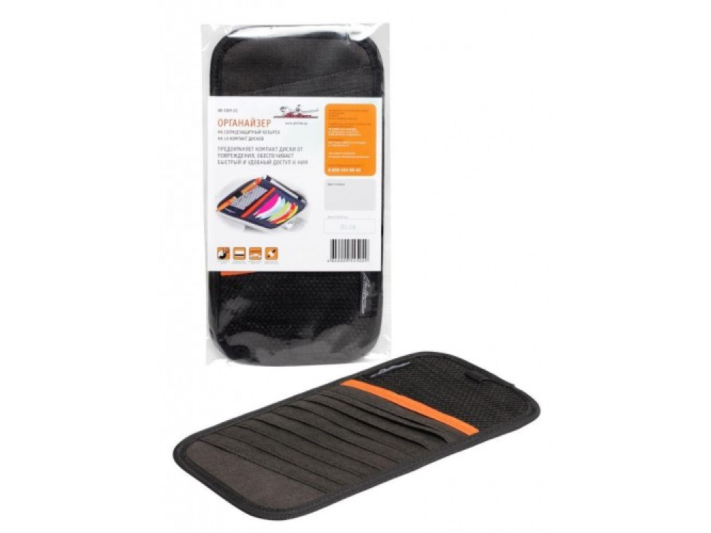 Органайзер имеет компактные размеры, предназначенные специально для солнцезащитного козырька автомобиля. Изделие оснащено отделами для хранения 10 CD-дисков, а также карманом для автомобильных документов. Полиэстер, использованный для изготовления изделия, невосприимчив к попаданию прямых солнечных лучей и позволяет продлить срок эксплуатации изделия. Изготовлен из 100% полиэстера.