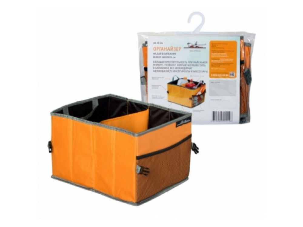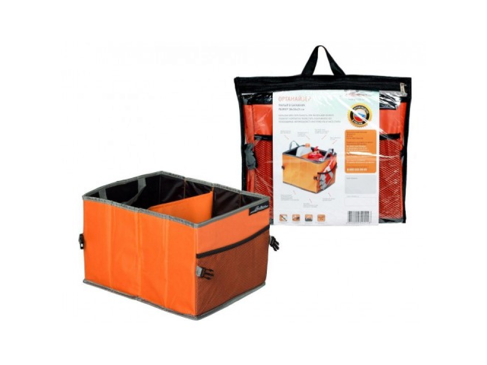 Благодаря своей конструкции имеет большой объем, два отсека и наружный карман, позволяющие разместить в нем все необходимые автомобилисту инструменты и аксессуары. Имеет удобные ручки для транспортировки. Компактный органайзер для багажника не займет много места в салоне автомобиля. Несмотря на небольшие размеры, органайзер является весьма вместительным и позволяет перевозить большое количество вещей. Для организации пространства изделие разделено на два отдела, а также оснащено карманом на внешней стороне сумки. Особая структура крепления на нижней наружной части органайзера препятствует скольжению сумки по салону автомобиля.