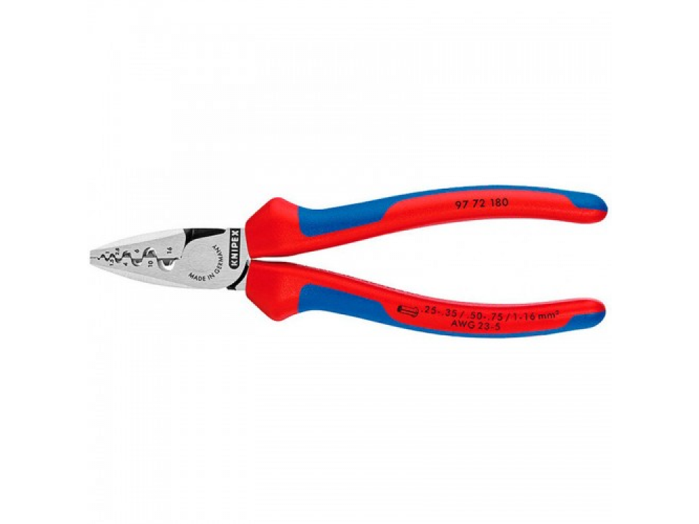 Идеальное соединение гильзы с проводником за счет oпрессовки в маркированных полукруглых профилях. Легкая и компактная конструкция инструмента обеспечивает оптимальную передачу усилия сжатия. Изготовлены из кованой, закаленной в масле специальной инструментальной стали. Полированная головка. Эргономичные ручки с с пластмассовым покрытием или двухкомпонентными чехлами. Количество гнезд с коническими гранями - 9.