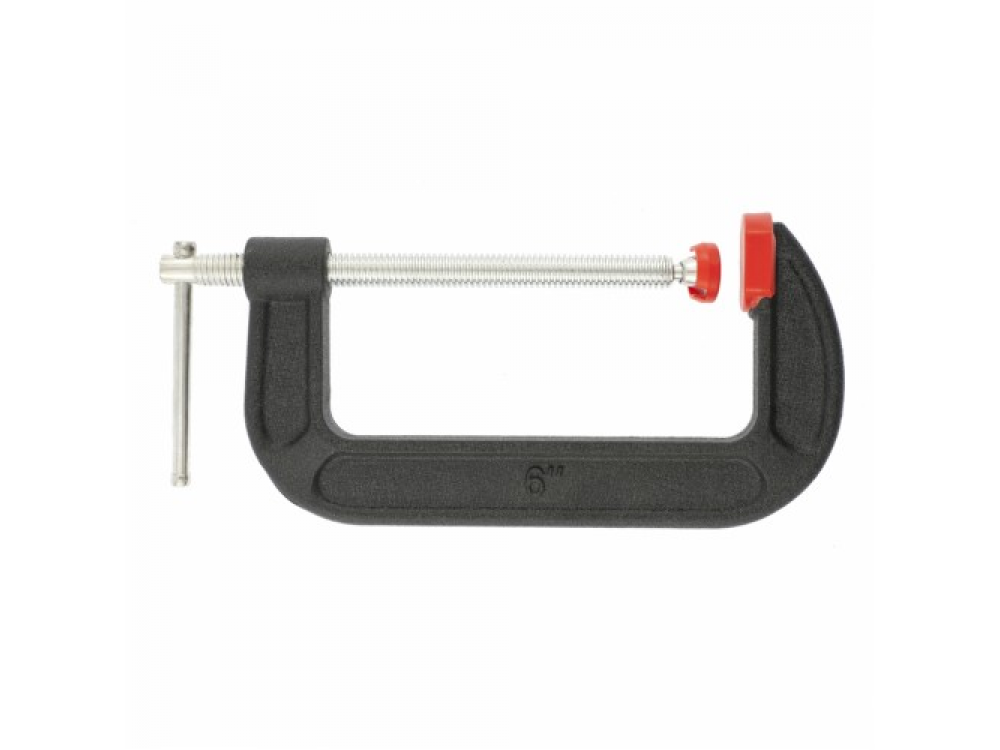 Корпус G-образной струбцины покрыт порошковой краской, стойкой к механическим повреждениям и надежно защищающей струбцину от коррозии. Губки снабжены накладками, предотвращающими повреждения обрабатываемых предметов. Винт струбцины с крупной червячной резьбой и воротком надежно фиксирует обрабатываемые детали.