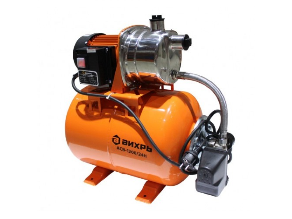 Автоматическая станция водоснабжения ВИХРЬ АСВ-1200/24Н применяется для подвода воды в систему водоснабжения дач, коттеджей, ферм. Агрегат оборудован производительным асинхронным двигателем мощностью 1200 Вт. При падении давления встроенный датчик автоматически включает насос. Вместительный резервуар (24 литра) сохраняет воду под давлением, чтобы не нагружать двигатель (не нужно постоянно закачивать воду) и сглаживать гидроудары. Специальные ножки придают устойчивость насосной станции. Для контроля уровня давления в системе предусмотрен барометр.